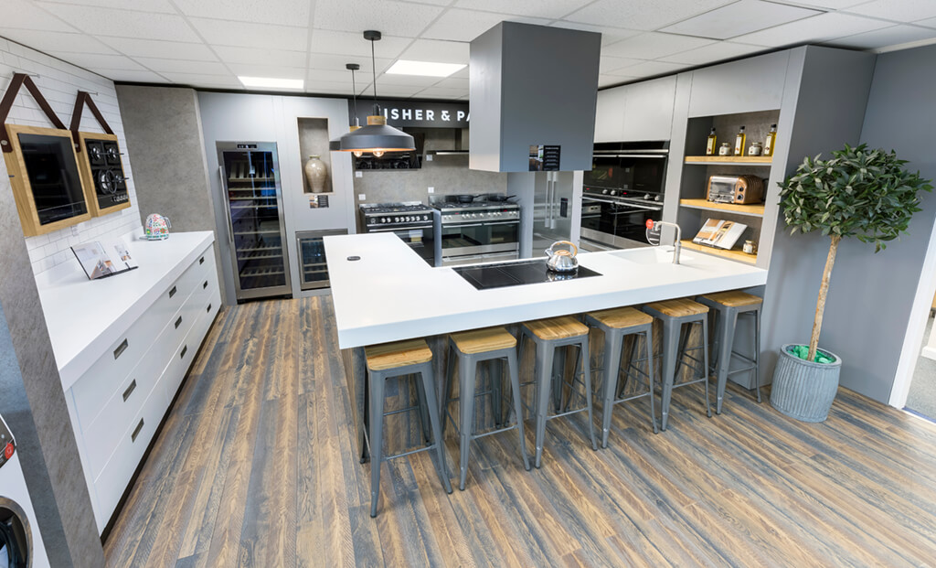 Our expert team designed and manufactured the beautiful worktop counters and bespoke wall decorations. We used LED lighting to enhance and fully showcase what Fisher & Paykel can offer, providing a great look and experience for potential customers.